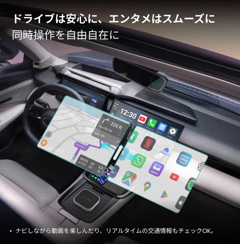 有線CarPlay/Android Autoをワイヤレス化し、自動接続。